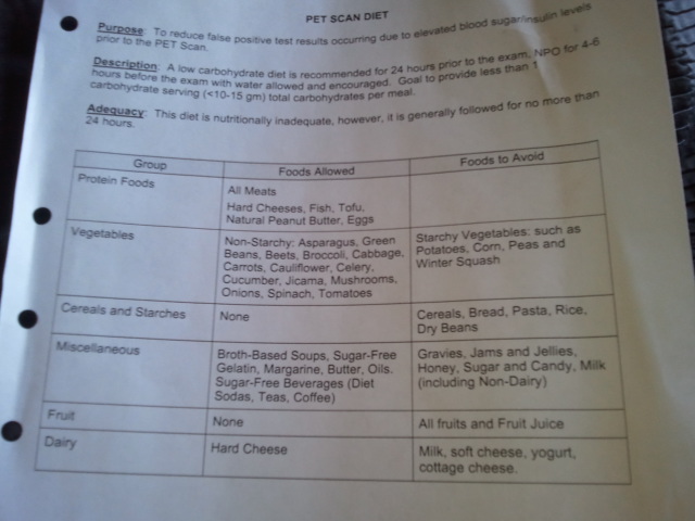 The diet effectively “starves the cancer” as much as possible so it is “hungry” for the fluorinated glucose. Take a look at the typical menu for the PET scan diet.