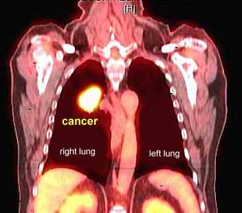 The fluorinated glucose is excreted by the kidneys so you can see them light up, but the lung cancer is extremely bright telling the doctors where the cancer is.